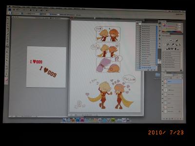 線が書き終わったら、フォトショップに放り込んで、バケツツールで色を塗っていって、文字の制作をして(左)バックの色を決めて囲うして、ほんのりエフェクトかけて。